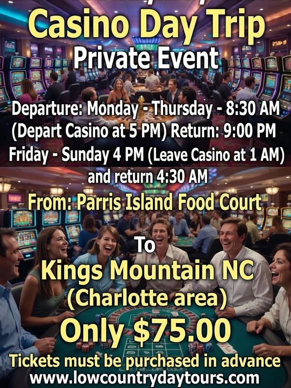 Low Country Day Tours & private Casino Trips Available. Reservations only.